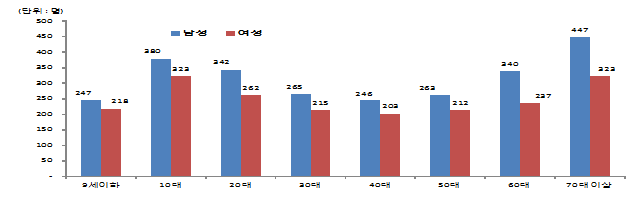 2015³â Àα¸ 10¸¸ ¸í´ç Áø·áÀοøÀ» ¿¬·É´ëº°·Î »ìÆìº¸¸é ³²¼ºÀº 70´ë ÀÌ»óÀÌ 447¸íÀ¸·Î °¡Àå ¸¹°í, 10´ë 380¸í, 20´ë 342¸í ¼øÀ̸ç, ¿©¼ºÀº 10´ë¿Í 70´ë ÀÌ»óÀÌ 323¸íÀ¸·Î °¡Àå ¸¹°í, 20´ë 262¸í ¼øÀ¸·Î ³ªÅ¸³µ´Ù.