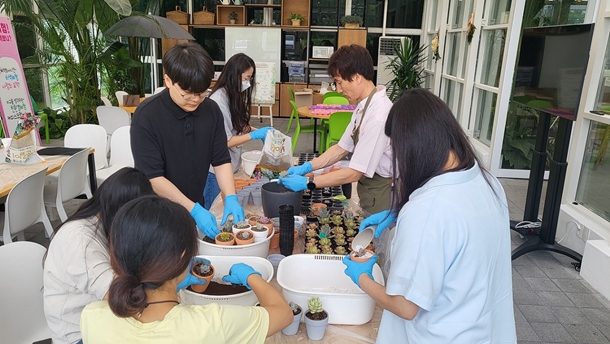 Çѵ¶ÀÌ ±×¸°±×¸°Àº Çѵ¶ »ý»ê°øÀå¿¡¼ ¹ß»ýÇÏ´Â ÆóÀÚÀ縦 Ȱ¿ëÇØ »õ·Î¿î ¹°°ÇÀ¸·Î Àçź»ý½ÃŰ´Â ¾÷»çÀÌŬ¸µ(Upcycling)À» ÅëÇØ ȯ°æÀ» Áö۰í Áö¿ª»çȸ¿¡ ³ª´®À» ½ÇõÇÏ´Â ºÀ»çȰµ¿ÀÌ´Ù. Çѵ¶ ÀÓÁ÷¿øµéÀº °øÀå¿¡¼ ¹ö·ÁÁö´Â ÆóÀ§»ýº¹À¸·Î ¿¡ÄÚ¹éÀ» ¸¸µé°í, Ä«Æä¿¡¼ ³ª¿À´Â Ä¿ÇÇ Â±â¸¦ Ȱ¿ëÇØ ºñ´©¿Í ´ÙÀ°½Ä¹° ȺÐÀ» Á¦ÀÛÇß´Ù.