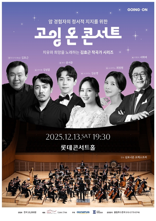 À̹ø¿¡ 13ȸ¸¦ ¸ÂÀº ¡®°íÀ× ¿Â ÄܼƮ¡¯´Â ¿À´Â 12¿ù 13ÀÏ ¿ÀÈÄ 7½Ã 30ºÐ¿¡ ·Ôµ¥ÄܼƮȦ¿¡¼ ¿¸°´Ù. ¡®°íÀ× ¿Â ÄܼƮ¡¯´Â ¿Ã¸²Çª½ºÇѱ¹ÀÇ ¾Ï °æÇèÀÚ Á¤¼Àû ÁöÁö ¹× »çȸÀû °ø°¨´ë Çü¼ºÀ» À§ÇÑ »çȸ°øÇåȰµ¿ ¡®°íÀ× ¿Â(Going-on) Ä·ÆäÀΡ¯ÀÇ ÀÏȯÀ¸·Î, ¾Ï °æÇèÀÚ¿Í °¡Á·ÀÌ À½¾ÇÀ» ÅëÇØ ¼ÒÅëÇÏ°í ¼·Î¸¦ ÀÀ¿øÇÒ ¼ö ÀÖµµ·Ï ¸¶·ÃµÆ´Ù. ¡®°íÀ× ¿Â¡¯Àº ¾Ï ¹ßº´ ÈÄ¿¡µµ ¾Ï °æÇèÀÚµéÀÇ ¾Æ¸§´Ù¿î »îÀº ¡®°è¼ÓµÈ´Ù¡¯´Â Àǹ̸¦ ´ã°í ÀÖ´Ù.