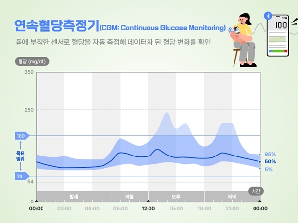 µû¶ó¼ ´ç´¢º´ Àü´Ü°è¿¡¼´Â ÀÚ½ÅÀÇ Ç÷´ç ¼öÄ¡¸¦ Á¤È®È÷ ¾Æ´Â °ÍÀÌ Áß¿äÇÏ´Ù. ³» Ç÷´çÀÌ ¾ðÁ¦, ¾î¶² ÀÌÀ¯·Î ¿À¸£´ÂÁö¸¦ ¾Ë¸é Á» ´õ Àü·«ÀûÀ¸·Î ´ç´¢º´À» ¿¹¹æÇÒ ¼ö ÀÖ´Ù. À̸¦ À§ÇØ ÃÖ±Ù¿¡´Â ¿¬¼ÓÇ÷´çÃøÁ¤±â(CGM: Continuous Glucose Monitoring)¸¦ Ȱ¿ëÇØ 24½Ã°£ µ¿¾È Ç÷´çÀÇ º¯È¸¦ ½Ç½Ã°£À¸·Î È®ÀÎÇÒ ¼ö ÀÖ´Ù. ¿¬¼ÓÇ÷´çÃøÁ¤±â¶õ ÆÈ¿¡ ¼¾¼¸¦ ºÎÂøÇØ ÀÏÁ¤ °£°ÝÀ¸·Î Ç÷´çÀ» ÀÚµ¿ÃøÁ¤Çϰí, ½º¸¶Æ®Æù ¾ÛÀ¸·Î µ¥ÀÌÅ͸¦ Àü¼ÛÇÏ´Â ÀåÄ¡´Ù. äÇ÷ ¾øÀÌ Ç÷´ç ¼öÄ¡¸¦ Áö¼ÓÀûÀ¸·Î ¸ð´ÏÅ͸µÇÏ´Â ¹æ¹ýÀ¸·Î, ½Ä»ç, ¿îµ¿, ¼ö¸é µî ÀÏ»ó Ȱµ¿¿¡ µû¸¥ ÀÚ½ÅÀÇ Ç÷´ç ¹ÝÀÀÀ» ½Ç½Ã°£À¸·Î üũÇÒ ¼ö ÀÖ´Ù.