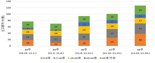 Áúº´°ü¸®Ã»ÀÌ ¿î¿µÇÏ´Â º´¿ø±Þ(210°³¼Ò)ÀÇ Àå°ü°¨¿°Áõ Ç¥º»°¨½Ã °á°ú, ³ë·Î¹ÙÀÌ·¯½º °¨¿°Áõ ȯÀÚ ¼ö´Â ÃÖ±Ù Áõ°¡ Ãß¼¼ÀÌ¸ç Æ¯È÷ ÀÛ³â 11¿ù 5ÁÖ µ¿±â°£ ´ëºñ ȯÀÚ ¼ö°¡ 58.8% Áõ°¡Çß´Ù. ƯÈ÷ Àüü ȯÀÚ Áß 0~6¼¼ÀÇ ¿µÀ¯¾ÆÀÇ ºñÁßÀÌ 29.9%¸¦ º¸¿´´Ù.