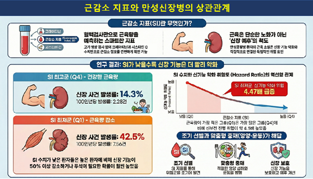 ±¹³» ¸¸¼º½ÅÀ庴 Àå±âÃßÀû ¿¬±¸(KNOW-CKD, ¿¬±¸Ã¥ÀÓÀÚ: ¼¿ï´ëº´¿ø ¿À±¹È¯ ±³¼ö)ÀڷḦ ºÐ¼®ÇÑ °á°ú, ±ÙÀ°·®ÀÌ ÀûÀº ȯÀÚ´Â ±ÙÀ°·®ÀÌ ¸¹Àº ȯÀÚº¸´Ù ½ÅÀå ±â´É ¾ÇÈ À§ÇèÀÌ ¾à 4.47¹è ³ôÀº °ÍÀ¸·Î ³ªÅ¸³µ´Ù. ¶ÇÇÑ ´Ü¹éÁú-¿¡³ÊÁö ¼Ò¸ð ÁöÇ¥Áß 3°³ ÀÌ»ó ÇØ´çÇϴ ȯÀÚ´Â »ç¸Á À§ÇèÀÌ ÃÖ´ë 3.78¹è Áõ°¡ÇÏ´Â °ÍÀ¸·Î È®ÀεƴÙ.
