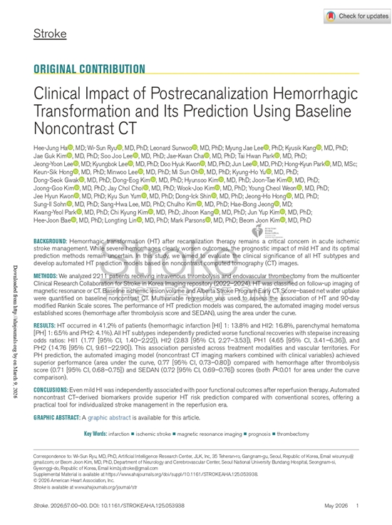 ÀÇ·á ÀΰøÁö´É(AI) Àü¹®±â¾÷ Á¦ÀÌ¿¤ÄÉÀÌ´Â ÀÚ»çÀÇ ºñÁ¶¿µ CT ÀÚµ¿ ºÐ¼® ±â¼úÀÌ ³úÁ¹Áß Àç°ü·ù ½Ã¼ú ÈÄ ¹ß»ýÇÏ´Â ÃâÇ÷¼º º¯È(hemorrhagic transformation)¸¦ ±âÁ¸ ¿¹Ãø µµ±¸º¸´Ù À¯ÀÇÇÏ°Ô Á¤È®È÷ ¿¹ÃøÇÒ ¼ö ÀÖ´Ù´Â ¿¬±¸ °á°ú°¡ ³úÁ¹Áß ºÐ¾ß ¼¼°èÀû ±ÇÀ§ÀÇ ÇмúÁö ¡®Stroke¡¯(¹Ì±¹½ÉÀåÇÐȸ, AHA ¹ßÇà, Impact Factor 7.0)¿¡ °ÔÀçµÆ´Ù°í ¹àÇû´Ù.