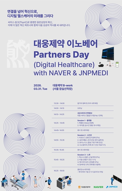 ´ë¿õÁ¦¾àÀº ¿À´Â 3¿ù 31ÀÏ ¼¿ï Àá½Ç ¼±ÂøÀå ¡®ºñ¿öÅ©(B-work)¡¯¿¡¼ ¡®´ë¿õÁ¦¾à À̳뺣¾î Partners Day (Digital Healthcare) with NAVER & JNPMEDI¡¯¸¦ °³ÃÖÇÑ´Ù°í ¹àÇû´Ù. À̹ø Çà»ç´Â ´ë¿õÁ¦¾àÀÌ ÁÖÃÖÇÏ°í ³×À̹ö, Á¦À̾ØÇǸ޵ð(JNPMEDI)°¡ °øµ¿ Âü¿©ÇØ, 3»ç°¡ ÇÔ²² ¹ß±¼¡¤À°¼ºÇØ ¿Â µðÁöÅÐ ÇコÄÉ¾î Æ÷Æ®Æú¸®¿À ±â¾÷µéÀÇ ¼º°ú¸¦ ¿ÜºÎ ½ÃÀå¿¡ °ø°³ÇÏ´Â ÀÚ¸®´Ù.
