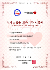 ¹Ì±¹½ÉÀåÇùȸ(AHA)¿Í ´ëÇÑ½ÉÆó¼Ò»ýÇùȸ(KACPR)¿¡¼ ÀÎÁõÇÏ´Â Àü¹®½ÉÆó¼Ò»ý¼ú(ACLS Training Site) ±³À°±â°üÀ¸·Î ¼±Á¤µÇ¾ú´Ù.