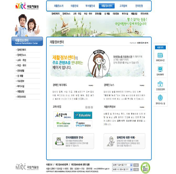±¹¸³ÀçȰ¿ø(¿øÀå Çã ¿ë)Àº ȨÆäÀÌÁö(www.nrc.go.kr)¸¦ »õ·Ó°Ô °³ÆíÇÏ¿© Àå¾ÖÀÎÀÇ º¹Áö, Àå¾ÖÀ맫º, ±³À°․Ãë¾÷, ¿©¼º․À°¾Æ, ¹®È»ýȰ, ¼ºÀçȰ, ÀÇ·áÁ¤º¸ ¹× ÀçȰ»ó´ã µî¿¡ °üÇÑ ¸ðµç Á¤º¸¸¦ ÇÑ °÷¿¡¼ ¼Õ½±°Ô ÀÌ¿ë ÇÒ ¼ö ÀÖµµ·Ï ¼ºñ½º¸¦ Á¦°øÇϰí ÀÖ´Ù.