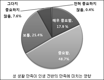 Á¶»ç°á°ú¿¡ µû¸£¸é, ¼º »ýȰ¿¡ ´ëÇÑ ¸¸Á·ÀÌ Àλý Àü¹ÝÀÇ ¸¸Á·¿¡ ¹ÌÄ¡´Â ¿µÇâ¿¡ ´ëÇØ ÀÀ´äÀÚÀÇ 17.9%°¡ ¸Å¿ì Áß¿äÇÔ, 48.7%°¡ Áß¿äÇÔÀ¸·Î ´äº¯Çß´Ù.