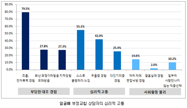 ¾ó±¼»À Àü¹®º´¿øÀÎ ¾ÆÀ̵𺴿øÀÌ 2009~2010³â µ¿¾È »ó´ãÀ» ÀÇ·ÚÇÑ ³²³à 205¸íÀ» ´ë»óÀ¸·Î Á¶»çÇÑ °á°ú, À¯³â½ÃÀýºÎÅÍ Áö±Ý±îÁö ÀØÈ÷Áö ¾Ê´Â ¾ð¾îÆø·ÂÀ» °æÇèÇÑ °æ¿ì°¡ 79.5%, ȳ Ç¥Á¤À» Áþ´Â´Ù¸ç ¿ÀÇØ ¹ÞÀº °æ¿ì°¡ 27.8%, ¹ßÀ½ µîÀ» ÁöÀû ¹ÞÀº °æ¿ìµµ 27.3%¿¡ ´ÞÇÏ´Â °ÍÀ¸·Î ¹àÇôÁ³´Ù.