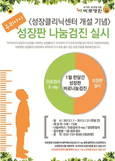 ¹Ù·Îº´¿øÀÇ À̹ø Çà»ç´Â ¼ºÀåŬ¸®´Ð¼¾ÅÍ °³¼³À» ±â³äÇØ ½Ç½ÃÇÏ´Â °ÍÀ¸·Î, ¶Ç·¡º¸´Ù 10cmÀÌ»ó À۰ųª, »çÃá±â°¡ ¿ÀÁö ¾Ê¾Ò´Âµ¥µµ 1³â¿¡ 4~5cmÀÌ»ó ÀÚ¶óÁö ¾Ê´Â ¾ÆÀ̵éÀ» À§ÇØ ¸¶·ÃµÆ´Ù. 5¼¼¿¡¼ 15¼¼±îÁöÀÇ ¾î¸°À̕û¼Ò³âÀ̶ó¸é ´©±¸³ª ½ÅûÀÌ °¡´ÉÇϸç, °Ë»ç´Â ¼ºÀåÆÇ °Ë»ç¿Í X-ray µÎ °¡Áö Ç׸ñÀ¸·Î ÁøÇàµÈ´Ù.