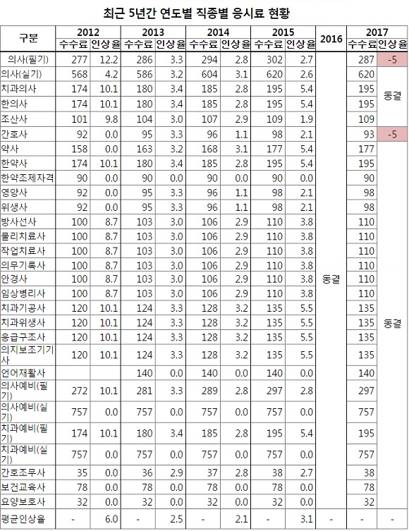 ³»³â ÀÀ½Ã¼ö¼ö·á¸¦ º¸¸é, ÀÇ»ç¿Í °£È£»ç ±¹½Ã¸¸ ÀÀ½Ã¼ö¼ö·á°¡ 5% ÀÎÇϵƴÙ.