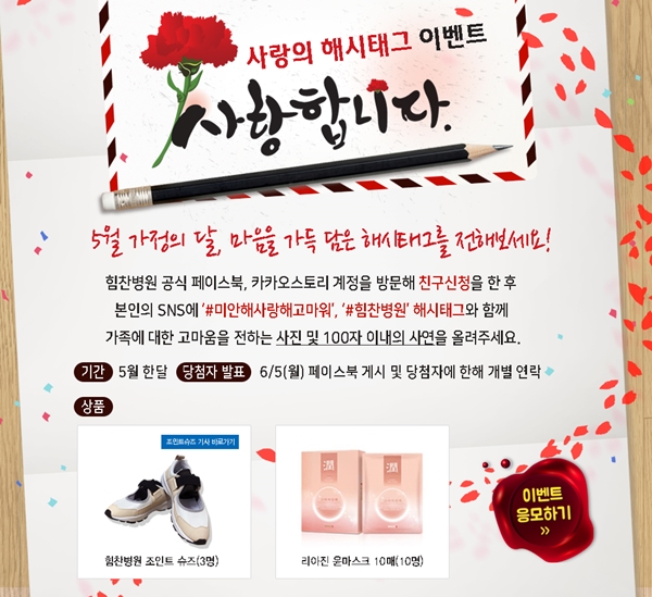 »ç¶ûÀÇ ÇØ½ÃÅÂ±× À̺¥Æ®´Â ÈûÂùº´¿øÀÇ °ø½Ä ÆäÀ̽ººÏ(https://www.facebook.com/himchanhp)°ú īī¿À½ºÅ丮(https://story.kakao.com/ch/himchan) °èÁ¤À» ¹æ¹®ÇØ Ä£±¸½ÅûÀ» ÇÑ ÈÄ °¡Á·¿¡°Ô °í¸¶¿òÀ» ÀüÇÏ´Â »çÁøÀ̳ª »ç¿¬À» ¡®#¹Ì¾ÈÇØ»ç¶ûÇØ°í¸¶¿ö¡¯, ¡®#ÈûÂùº´¿ø¡¯ ÇØ½ÃÅÂ±×¿Í ÇÔ²² °³ÀÎ SNS¿¡ ¾÷·Îµå¸¦ ÇÏ¸é µÈ´Ù.