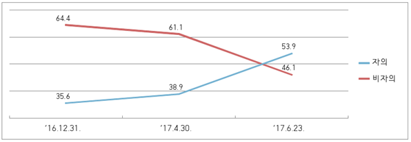 Àüü ÀÔ¼ÒÀÚ ¼ö¿¡¼ ÀÚÀÇÀÔ¼Ò ºñÀ²Àº ¹ý ½ÃÇà ÈÄ ¿ÃÇØ 6.23ÀÏ ÇöÀç ÀÚÀÇÀÔ¼Ò ºñÀ²Àº 53.9%À¸·Î, ÀÛ³â 12.31ÀÏ ±âÁØ 35.6%, ¿ÃÇØ 4.30ÀÏ ±âÁØ 38.9%¿Í ºñ±³ÇÏ¿©, 18.3%p¿¡¼ 15.0%p ´ëÆø ³ô¾ÆÁ³´Ù.