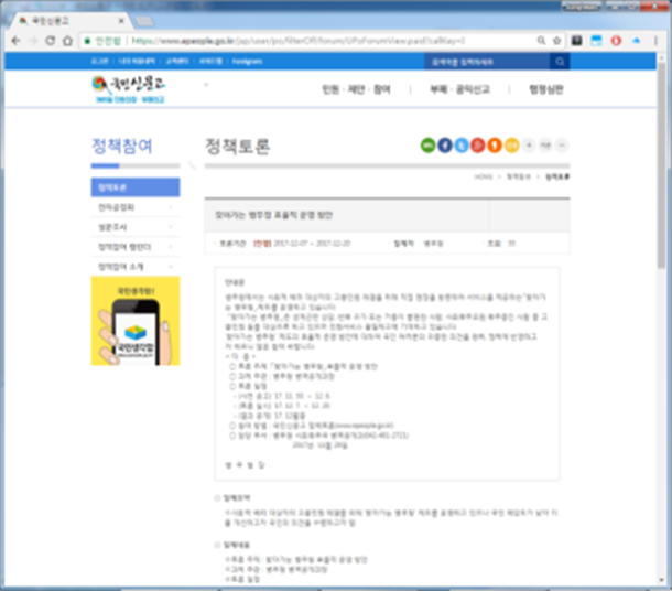 ÇàÁ¤ÀýÂ÷¹ý 53Á¶ 1Ç׿¡ µû¸£¸é ÇàÁ¤Ã»Àº ±¹¹Î¿¡°Ô ¿µÇâÀ» ¹ÌÄ¡´Â ÁÖ¿ä Á¤Ã¥ µî¿¡ ´ëÇÏ¿© ±¹¹ÎÀÇ ´Ù¾çÇϰí âÀÇÀûÀÎ ÀǰßÀ» ³Î¸® ¼ö·ÅÇϱâ À§ÇÏ¿© Á¤º¸Åë½Å¸ÁÀ» ÀÌ¿ëÇÑ Á¤Ã¥Åä·ÐÀ» ½Ç½ÃÇÒ ¼ö ÀÖ´Ù.