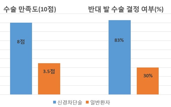 ¼ö¼ú ÈÄ ¸¸Á·°¨Àº ½Å°æÂ÷´Ü¼ú ½ÃÇà ȯÀÚ°¡ 10Á¡ ¸¸Á¡¿¡ 8Á¡À» ±â·ÏÇØ ÀÏ¹Ý È¯ÀÚÀÇ 3.5Á¡ º¸´Ù ¾à 2¹è °¡·® ³ô°Ô ³ªÅ¸³µ´Ù. ³ô¾ÆÁø ¸¸Á·°¨Àº ¹Ý´ë ÂÊ ¹ß¿¡ ´ëÇÑ ¼ö¼ú °áÁ¤À¸·Î À̾îÁ³´Ù. ÀÏ¹Ý È¯ÀÚÀÇ 30%°¡·®ÀÌ ¹Ý´ë ÂÊ ¹ß ¼ö¼úÀ» °áÁ¤ÇÏÁö¸¸ ½Å°æÂ÷´Ü¼ú ȯÀÚ´Â ¾à 83%°¡ ¼ö¼úÀ» ½ÃÇàÇß´Ù.