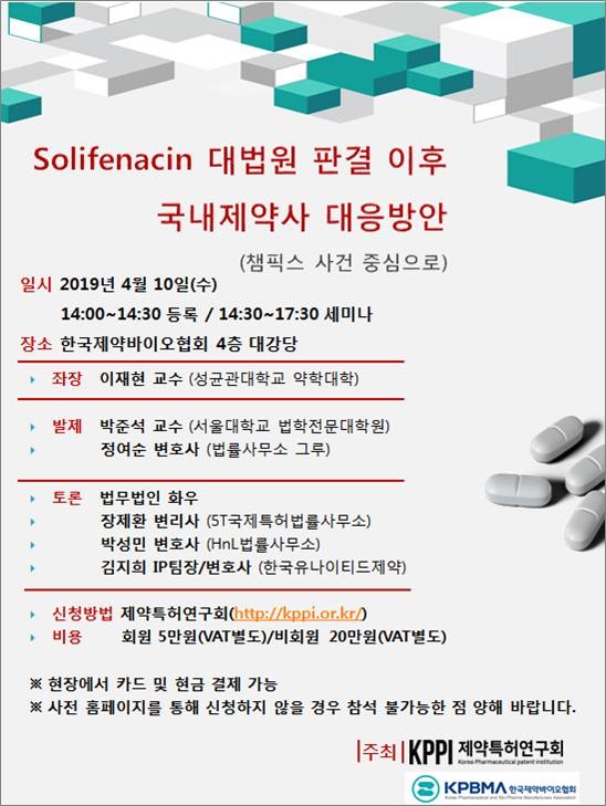 Á¦¾àƯÇ㿬±¸È¸¿Í Çѱ¹Á¦¾à¹ÙÀÌ¿ÀÇùȸ°¡ ¿À´Â 4¿ù 10ÀÏ Á¦¾à¹ÙÀÌ¿ÀÇùȸ ´ë°´ç¿¡¼ ¡®¼Ö¸®Æä³ª½Å(Solifenacin) ´ë¹ý¿ø ÆÇ°á ÀÌÈÄ ±¹³» Á¦¾à»ç ´ëÀÀ¹æ¾È(èÇȽº »ç°ÇÀ» Áß½ÉÀ¸·Î)¡¯À» ÁÖÁ¦·Î ¼¼¹Ì³ª¸¦ °³ÃÖÇÑ´Ù.