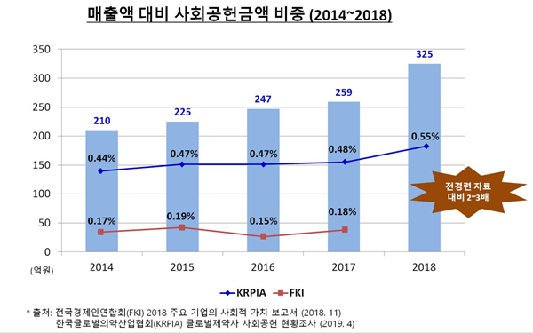 Çѱ¹±Û·Î¹úÀǾà»ê¾÷Çùȸ(ÀÌÇÏ KRPIA)°¡ ȸ¿ø»ç¸¦ ´ë»óÀ¸·Î Á¶»çÇÑ ¡®2018³â ±Û·Î¹úÁ¦¾à»ç »çȸ°øÇå ÇöȲ¡¯¿¡ µû¸£¸é, Á¶»ç¿¡ Âü¿©ÇÑ 29°³ ±Û·Î¹úÁ¦¾à»çµéÀÇ ±âºÎ±ÝÀ» Æ÷ÇÔÇÑ »çȸ°øÇåȰµ¿±Ý¾×ÀÌ 2018³â ¾à 325¾ï¿øÀ¸·Î, Àü³â 259¾ï¿ø ´ëºñ 66¾ï¿øÀÌ Áõ°¡ÇÑ °ÍÀ¸·Î ³ªÅ¸³µ´Ù.