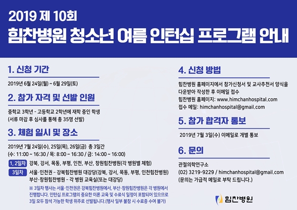 ¡®ÈûÂùº´¿ø û¼Ò³â ¿©¸§ ÀÎÅϽʡ¯Àº ¹Ì·¡ ÀÇ·áÀÎÀ¸·Î ¼ºÀåÀ» ²Þ²Ù´Â Áß¡¤°íµîÇлýµéÀÌ Á÷Á¢ ÀÇ·á ÇöÀåÀ» µÑ·¯º¸¸ç ¸ñÇ¥¸¦ ½ÇÇöÇÒ ¼ö ÀÖµµ·Ï µ½´Â Á÷¾÷üÇè ÇÁ·Î±×·¥ÀÌ´Ù. ÈûÂùº´¿øÀº Àç´É±âºÎ¸¦ ÅëÇØ ÇлýµéÀÌ ÀÚ½ÅÀÇ ²ÞÀ» ±¸Ã¼ÀûÀ¸·Î °èȹÇÒ ¼ö ÀÖµµ·Ï µ½°íÀÚ Áö³ 2010³â óÀ½ ½Ç½ÃÇÑ ÀÌ·¡ ¿ÃÇØ 10³â° ²ÙÁØÈ÷ À̾î¿À°í ÀÖ´Ù.
