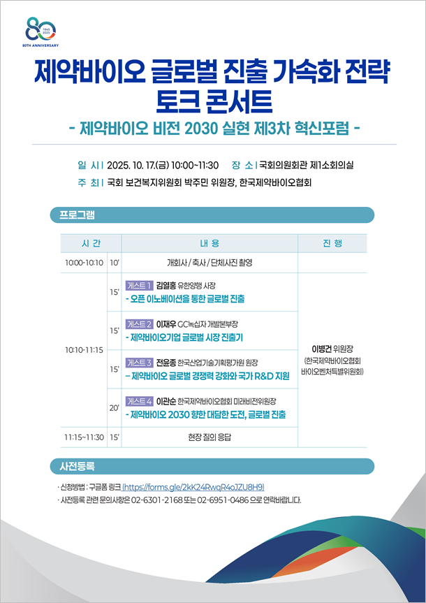 Çѱ¹Á¦¾à¹ÙÀÌ¿ÀÇùȸ´Â ±¹È¸ º¸°Çº¹ÁöÀ§¿øÈ¸ ¹ÚÁֹΠÀ§¿øÀå°ú ÇÔ²² ¿À´Â 10¿ù 17ÀÏ ¿ÀÀü 10½Ã ±¹È¸ ÀÇ¿øÈ¸°ü Á¦1¼ÒȸÀǽǿ¡¼ ¡®Á¦¾à¹ÙÀÌ¿À ºñÀü 2030 ½ÇÇö Á¦3Â÷ Çõ½ÅÆ÷·³ – Á¦¾à¹ÙÀÌ¿À ±Û·Î¹ú ÁøÃâ °¡¼ÓÈ Àü·« ÅäÅ© ÄܼƮ¡¯¸¦ °³ÃÖÇÑ´Ù.