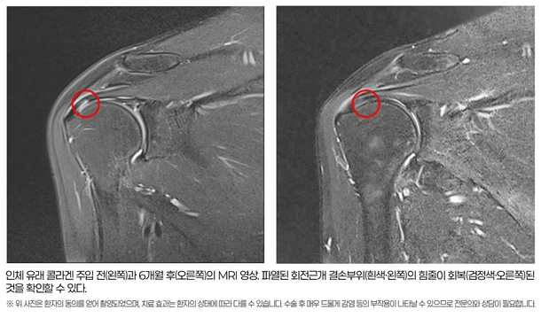 ÈûÂùº´¿øÀÇ À̹ø ¿¬±¸ °á°ú´Â ÀÎü À¯·¡ Äݶó°ÕÀÌ ¾àÇØÁø ÈûÁÙ Á¶Á÷ÀÇ Àç»ýÀ» µ½´Â ¡®ÁöÁö´ë(Scaffold)¡¯ ¿ªÇÒÀ» ¼öÇàÇÔÀ¸·Î½á Á¶Á÷ÀÇ È¸º¹À» ÃËÁøÇÑ´Ù´Â »ç½ÇÀ» ÀÔÁõÇß´Ù. ÀÌ´Â Äݶó°Õ ÁÖÀÔÀÌ È¸Àü±Ù°³ ÆÄ¿ ºÎÀ§ÀÇ ±¸Á¶Àû Ä¡À¯¸¦ À¯µµÇÒ ¼ö ÀÖ´Ù´Â ÀÓ»óÀû ±Ù°Å¸¦ È®º¸Çß´Ù´Â Á¡¿¡¼ ÇмúÀû °¡Ä¡°¡ ³ô´Ù.