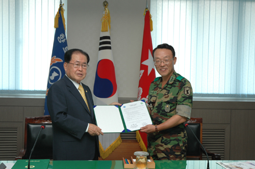 ±èÈñ¼ö °Ç¾ç´ë ÃÑÀå(¿ÞÂÊ)°ú ÀÌÈ«±â À°±º Á¦32º¸º´»ç´ÜÀå(¿À¸¥ÂÊ)ÀÌ Çù¾àÀ» ¸Î°í ±â³ä Æ÷Á ÃëÇϰí ÀÖ´Ù.